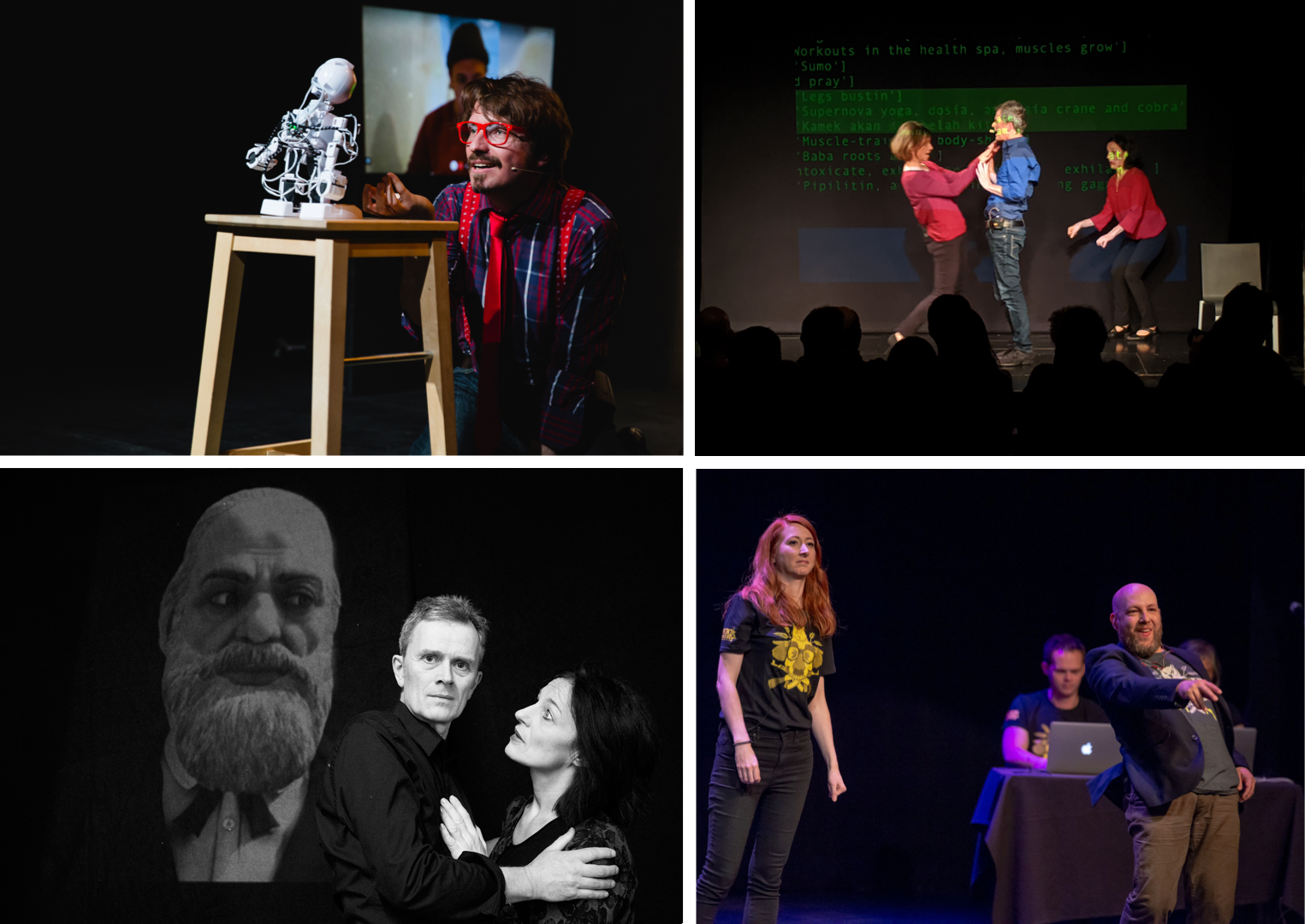 Top Left: Improv with a robotic digital agent controlled by an AI chatbot. Top Right: Improv where a human actor reads lines from the AI chatbot displayed on a screen. Bottom Left: Psychotherapist chatbot ELIZA appearing as a projection. Bottom Right: Improv (downstage) with one actor receiving lines from an AI chatbot controlled by a computer operator (upstage).