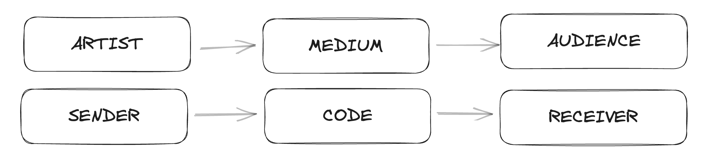 When I think about the relationship between artist, audience, and medium, I think about Claude Shannon. Shannon was a computer scientist who worked on codebreaking and secure communications during World War II. Shannon formalized theories around communication from a speaker to a receiver.