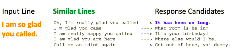 This is a fantastic dataset that is well formatted and easy to parse. To generate interesting and meaningful responses to the text messages from audience members, it follows a clever algorithm. First, find lines in the database which are most similar to the audience input line. Second, randomly return the response to one of these lines.
