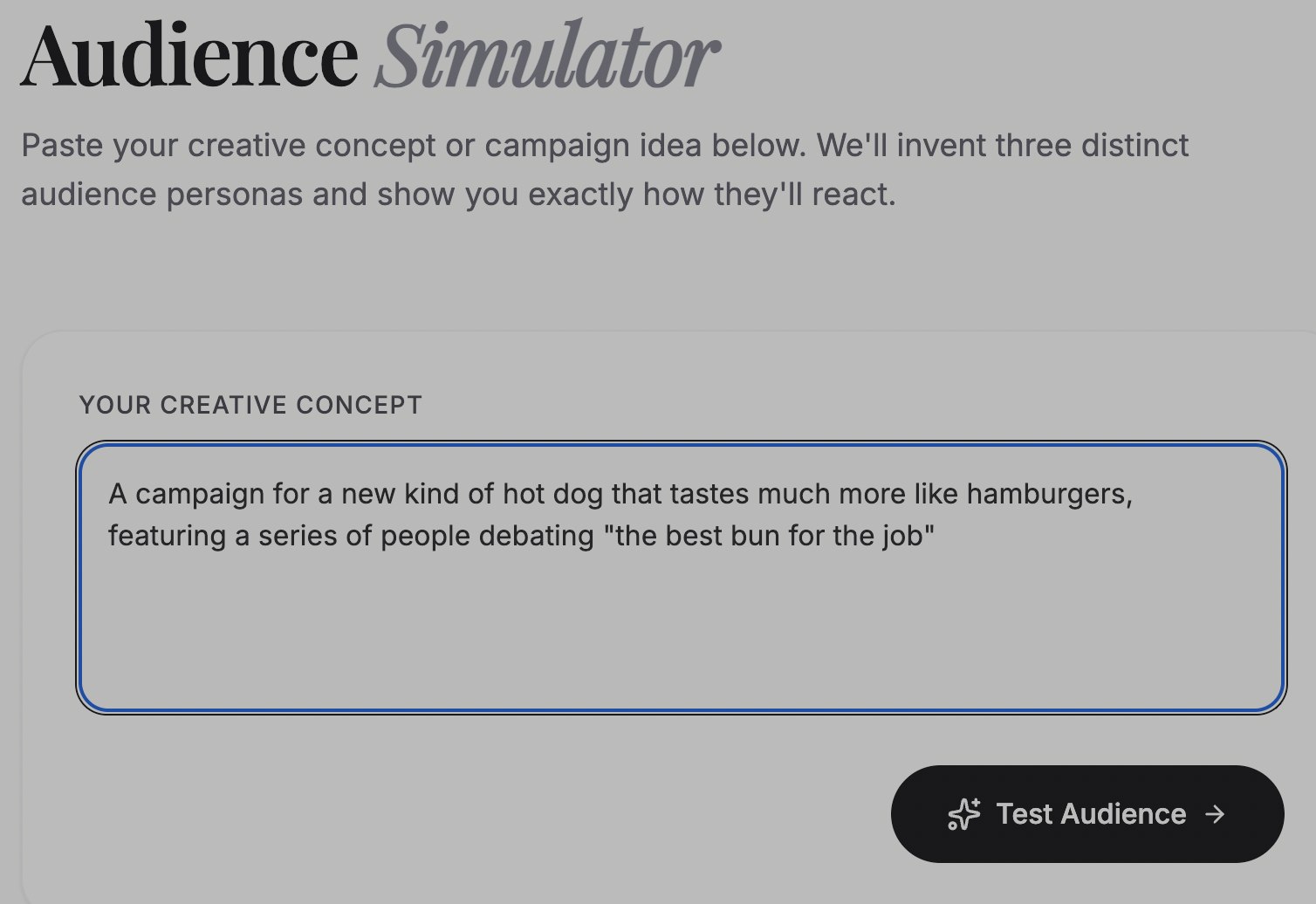 Make me a simple web app where I can paste a new creative concept or campaign idea. Underneath, I want a ‘Test Audience’ button. When I click it I want the app to invent three completely different audience personas—give them ages, jobs and a quick personality summary. Then, show me a card for each person explaining how they would emotionally react to my idea, what they’d love about it, and one highly specific suggestion for how I could tweak the creative to get a better response from that audience.Immediately, AI Studio starts to code my custom app. And it creates something that looks like this.