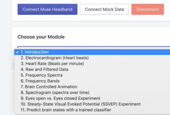 EEGEdu is an open source collaborative project with NeurotechX’s NeurotechEdu and Interaxon. The online tutorial is made using a Muse connection by Web Bluetooth using muse-js by Uri Shaked who has an excellent introduction to EEG A Techy’s Introduction to Neuroscience.