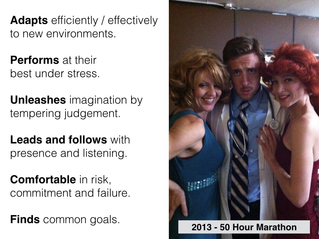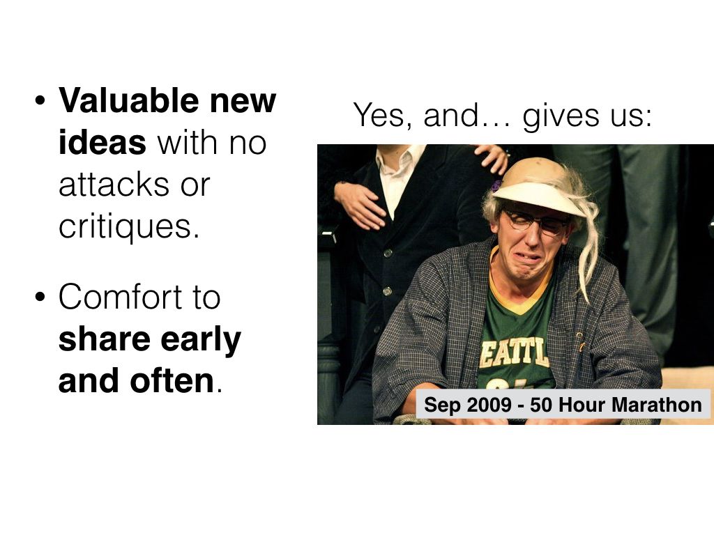 I earned my stripes improvising in long 50-hour marathons. These grueling time tests stretch physical and mental abilities and provide an incomparable safe playground of practice.