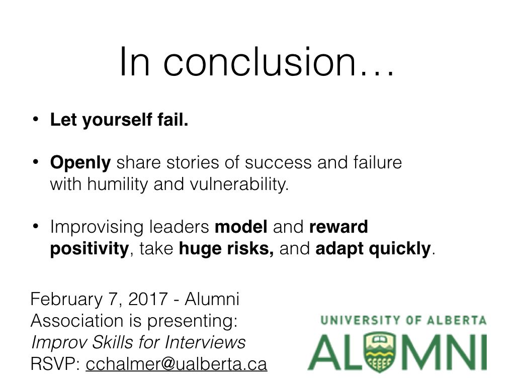 Recently I was invited to give a talk on Leadership in Improvisation for the Peter Lougheed Leadership College at the University of Alberta breakfast event about Making Connections.